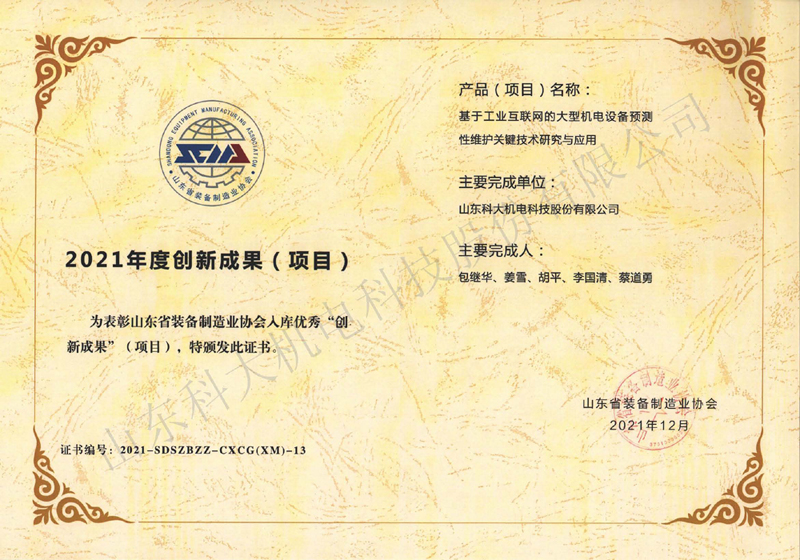 12月,公司入選山(shān)東省裝備制造業協會副會長(cháng)單位,董事長(cháng)包繼華榮獲“山(shān)東省裝備制造業2021年(nián)度優秀企業家稱号”,公司“基于工(gōng)業互聯網的大型機電設備預測性維護關鍵技術(shù)研究與應用”項目獲評“山(shān)東省裝備制造業2021年(nián)度優秀創新成果”。